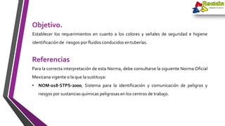 Web nom-026-stps-2008 Colores y señales de seguridad e higiene e identificación de riesgos por fluidos conducidos en tuberías. Normas complementarias de la norma Objetivo. Web nom-026-stps-2008 OBJETIVO Establecer los requerimientos en cuanto a los colores y señales de seguridad e higiene y la identificación de riesgos por fluidos conducidos en.